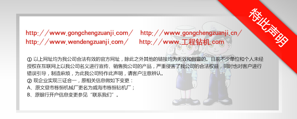 威海市棟恒鉆機廠隸屬于文登市工程鉆機廠,主要生產、銷售工程鉆機。它坐落于文登市西鋪頭工業園,這里科技發達,交通便利,制造業集中。 自1982年建廠以來,經過多年的優化改革和沉淀積累,擁有精密、大型加工設備近百臺的生產企業之一?,F在研制成功的GJ-400、GJ-250S、GJ-250A、GJ-240S、GJ-240A、GJ-180S、GJ-180A型等鉆機。在其它產品上,企業建立了長期、中期、短期的發展規劃,一系列的高性能產品正在不斷推出中,企業應市場需求對系列產品進行了優化組合,開發了與之對應配套的三腿、四腿單天車輪、雙天車輪鉆塔;泥漿泵—BW-160Q、BW- 200Q型球形閥泥漿泵大大提高了泵的使用性能和機械效率